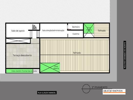 3º piso: Acesso via escada de caracol, com 02 salas e 01 banheiro. Área externa com terraço descoberto e livre. (Podendo ser utilizado como sala da diretoria ou departamento administrativo).