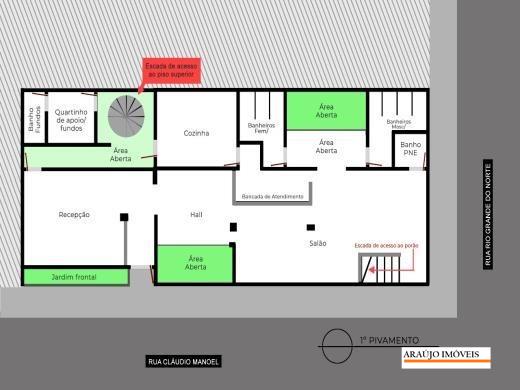 2º piso (Principal): Piso de acesso à Rua com 01 entrada principal, 02 salas de entrada, jardim de inverno interno, 01 bancadão com salão livre. 03 banheiros sendo 01 PNE. 01 Cozinha. Corredor aberto na área externa com 01 quarto de fundos com 01 banheiro, escada em caracol com acesso ao 3º piso. (Quarto podendo ser utilizado com cozinha, despensa ou departamento administrativo).